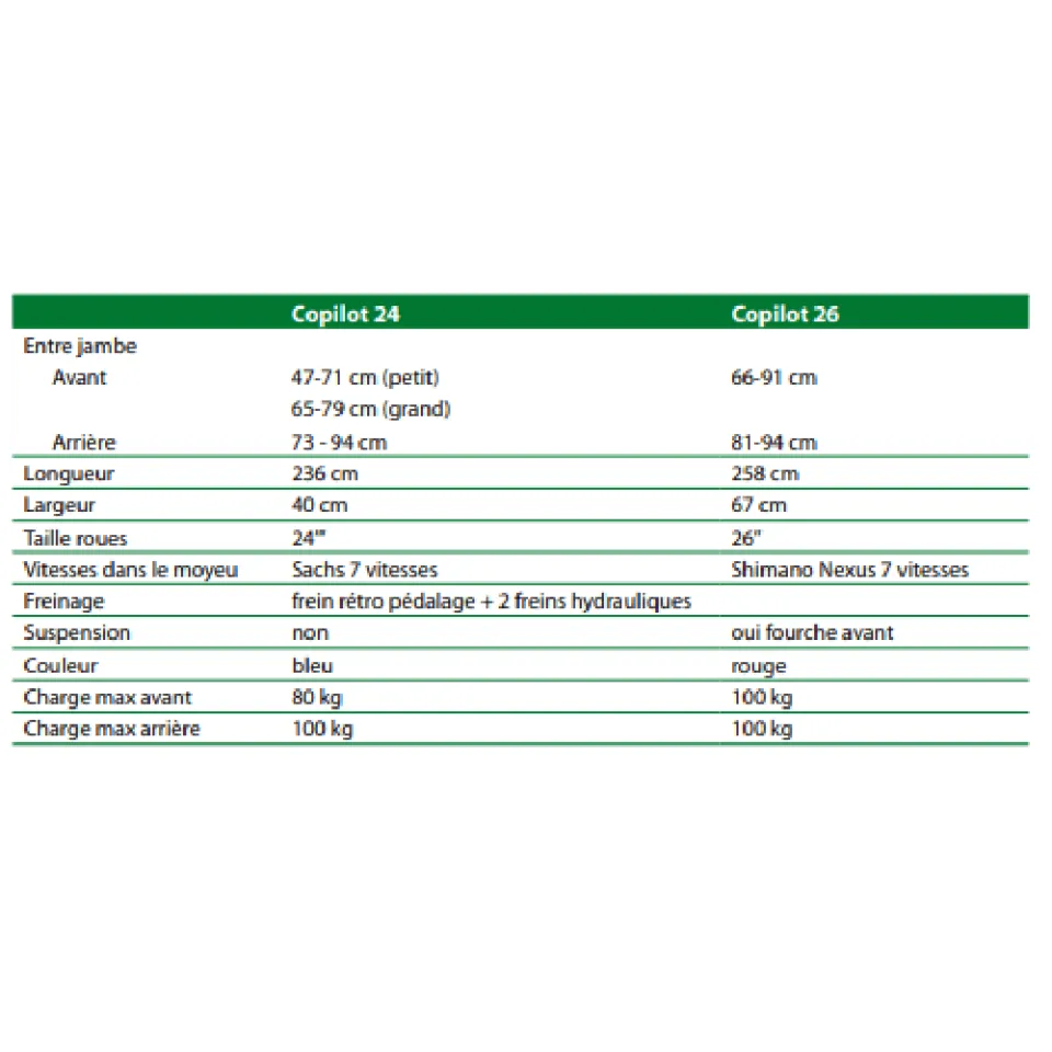 Le Copilot est un tandem thérapeutique où la personne handicapée est assise à l’avant. Le pilote est assis à l’arrière et détient les commandes : freins, vitesses et direction. Il peut également surveiller le copilote assis devant lui. Le copilote est assis à l’avant et profite des sensations d’un cycliste : vue dégagée et cheveux dans le vent. Le Copilot peut être équipé de différents accessoires facilitant le positionnement et le maintien de la personne handicapée sur le tandem. Le guidon avant est soit fixe (monté sur une tubulure) soit relié à la direction (monté sur la fourche avant). Le freinage est assuré par des freins hydrauliques à l'avant et à l'arrière et d'un frein rétropédalage agissant sur la roue arrière. Le pédalage est synchrone: les pédaliers sont reliés et tournent ensemble. L'effort est donc partagé et la personne handicapée participe activement au pédalage. En option il est possible d'avoir un pédalier libre ou un pédalier débrayable à l'avant. Le Copilot existe en 2 tailles: roues de 24" ou de 26". La taille, mais surtout l'entrejambe des cyclistes déterminent le choix du vélo.