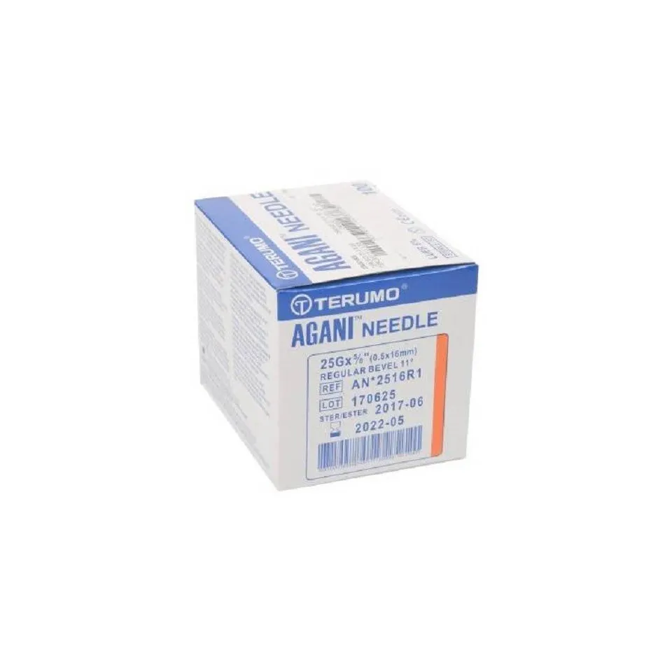 >Les aiguilles TERUMO en acier inoxydable triple biseau sont conformes aux normes.françaises. Elles sont stérilisées à l'oxyde d'éthylène. Les aiguilles hypodermiques, de différents diamètres et de différentes longueurs, sont utilisées pour des injections cutanées. Ses bords affûtés avec précision et la conception unique du biseau permettent une pénétration des tissus sans résistance et pratiquement indolore. Les aiguilles sont conditionnées par boîte de 100 aiguilles. Injection sous cutanée. Boîte de 100 aiguilles. Injection sous cutanée. Boîte de 100 aiguilles.