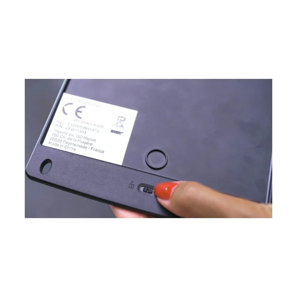 Utilisez le stylo fourni pour écrire vos notes sur l’ardoise. Pour effacer, appuyez sur le bouton dédié. Activez le commutateur de sécurité pour verrouiller l’écriture et éviter toute suppression accidentelle. Remplacez la pile CR2025 lorsque nécessaire.