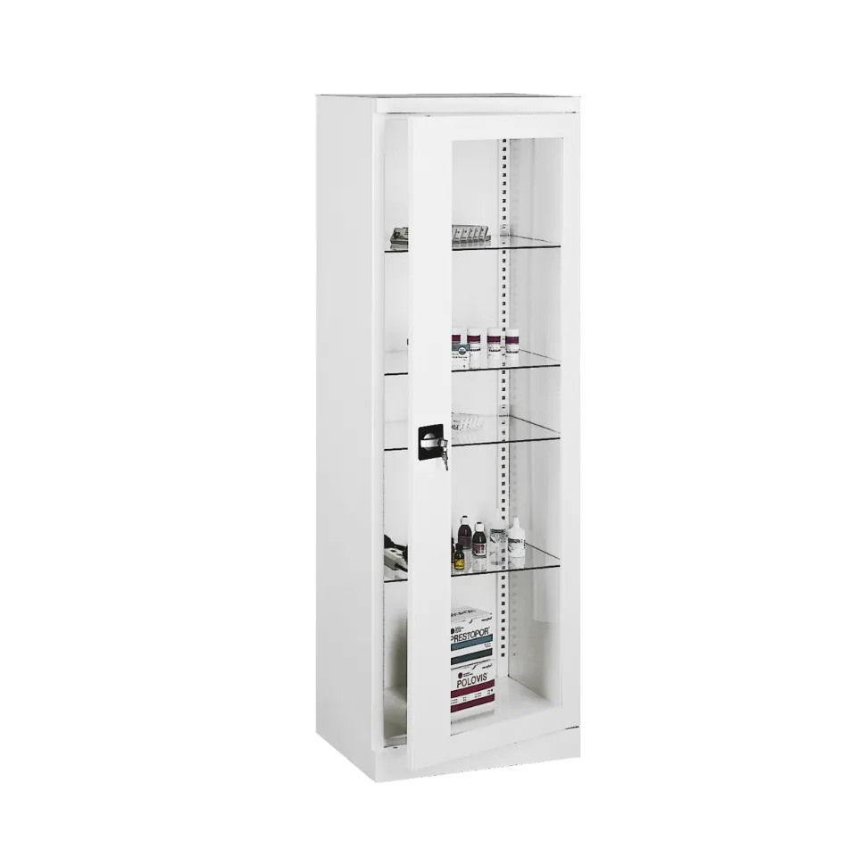 L'armoire est équipée d'une porte vitrée battante avec une serrure à 2 points de fixation pour garantir la sécurité de vos objets. La porte vitrée permet de voir aisément l'intérieur de l'armoire à pharmacie. Les quatre étagères en verre réglables offrent une grande flexibilité pour organiser vos produits et instruments de différentes tailles.