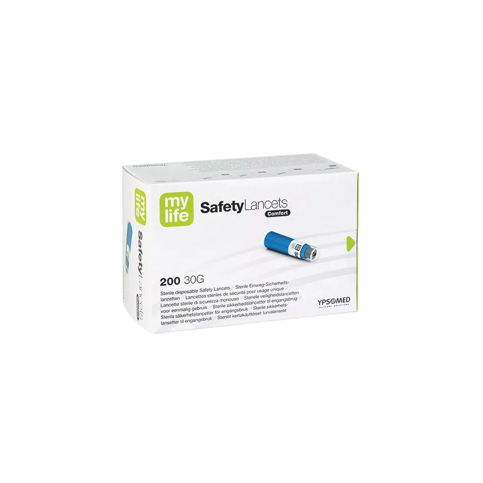 Lancettes de sécurité Mylife Confort 30g Les lancettes de sécurité Mylife présentent une conception innovante brevetée qui rend le prélèvement de sang capillaire sûr et facile. Conçues pour la surveillance de la glycémie et d'autres tests de diagnostic dans les cliniques pour diabétiques, les hôpitaux et les soins à domicile privés, les lancettes de sécurité mylife sont dotées d'un sceau de sécurité qui indique visuellement si elles ont été utilisées avant ou non et sont inopérantes après utilisation grâce à la fonction de déclenchement unique. Son capuchon de protection maintient la stérilité et empêche la contamination avant utilisation, ainsi que la protection des patients et des professionnels de la santé contre la contamination croisée ou les blessures. Aucun pré-chargement ou assemblage n'est requis avant l'utilisation, ils sont donc rapides et faciles à utiliser. Les lancettes de sécurité Mylife utilisent une pointe d'aiguille à trois biseaux pour une qualité d'aiguille supérieure afin de soutenir un flux sanguin optimal avec un confort maximal pour le patient. Boite de 200 lancettes