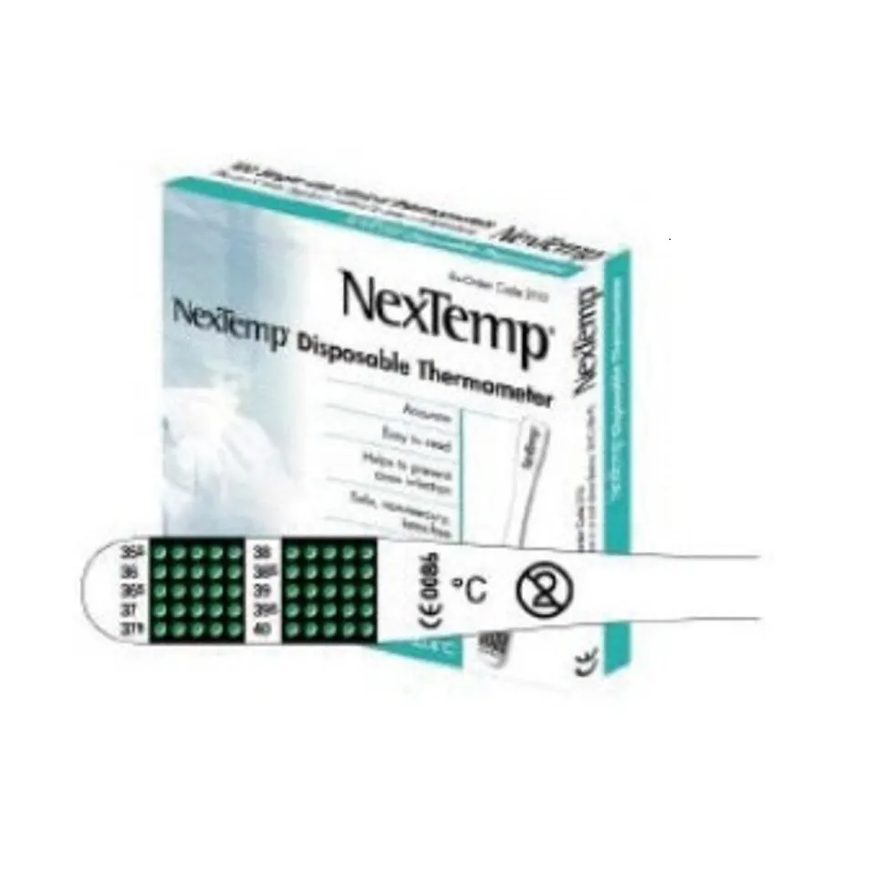 Le thermomètre NexTemp fonctionne grâce à un système de cristaux liquides, sans piles, il est écologique et directement prêt à l'emploi. Emballé dans sa pochette individuelle, il est destiné à un usage individuel. Pouvant être réutilisé afin d'avoir un suivi simple et régulier de la température, la résolution du contrôle de température se fait rapidement et est lisible via le système de cristaux liquides sur le thermomètre. Le thermomètre Nextemp est utilisable via voie buccale, annale, axillaire Le thermomètre NexTemp fonctionne grâce à un système de cristaux liquides, sans piles, il est écologique et directement prêt à l'emploi. Emballé dans sa pochette individuelle, il est destiné à un usage individuel. Pouvant être réutilisé afin d'avoir un suivi simple et régulier de la température, la résolution du contrôle de température se fait rapidement et est lisible via le système de cristaux liquides sur le thermomètre. Le thermomètre Nextemp est utilisable via voie buccale, annale, axillaire Caractéristiques techniques : Type de prise avec réglette via voie : Buccale , Axillaire , anale non adapté pour les bébés et enfants de moins de 2 ans Gamme de prise de mesure : De + 35,5°C à + 40,4°C Précision : 0.1°C Structure : Bande en plastique contenant 50 cavités disposées sur une double matrice située à l’extrémité sensible du thermomètre Sécurité Les cristaux liquides utilisés sont non toxiques, non irritants et non allergisants Thermomètre individuel réutilisable. Date de péremption : Ces thermomètres sont valables 5 ans à compter de leur fabrication. Leur date de péremption est indiquée sur la boîte. Conditionnement : Boite de 4 ou de 100 Temps de mesure : En fonction du site de prise, 1 mn buccal et 3 mn axillaire