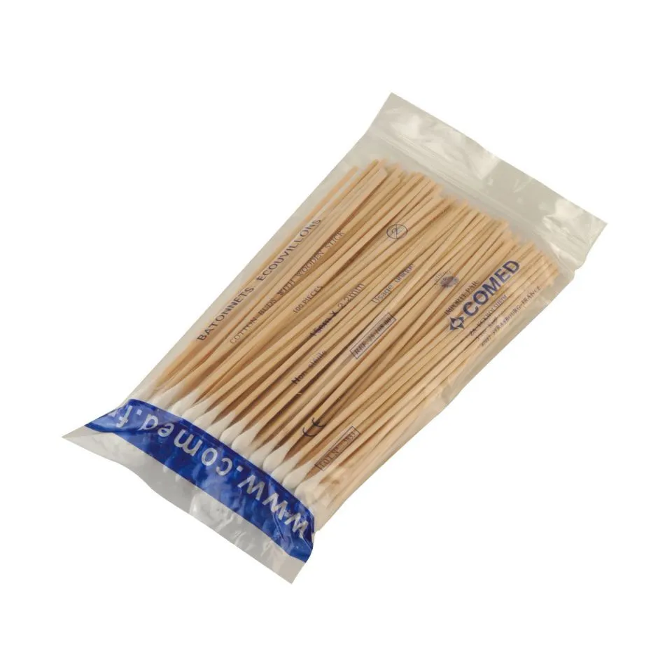 Bâtonnets écouvillons avec embout coton 15 mm et tige en bois 15 cm. Conditionnement par 100.