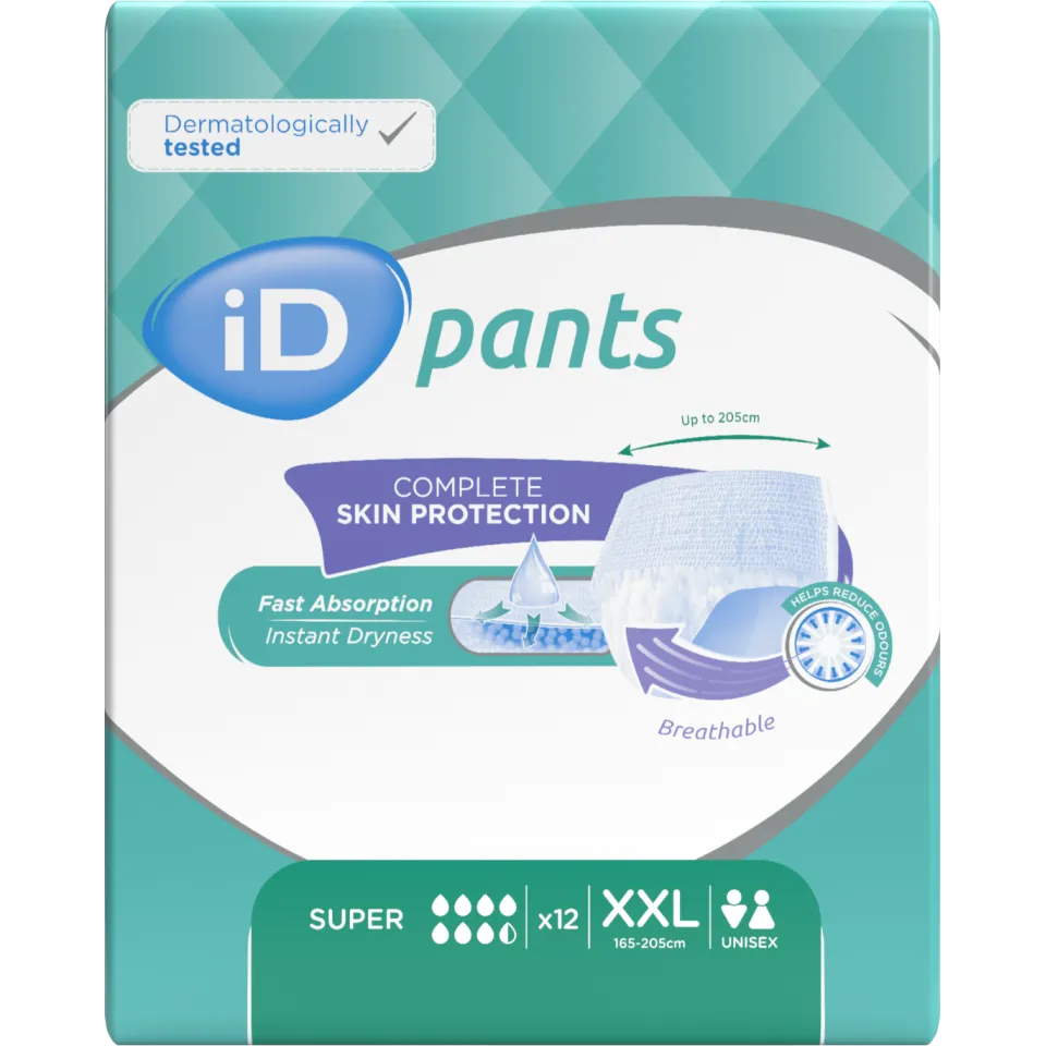 Les culottes jetables iD Pants sont dédiées aux personnes actives rencontrant des épisodes d'incontinence moyenne à sévère. Conçues comme de véritables sous-vêtements, elles s'enfilent et s'enlèvent de la même manière. Faciles d'utilisation, confortables et discrètes, les culottes iD Pants permettent de profiter pleinement de la vie. - contrôle des odeurs - absorption rapide - ajustement parfait - témoin d'humidité - sensation coton - testé dermatologiquement - sans latex