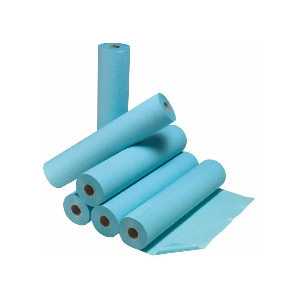 Ce drap sans latex plastifié , en ouate est multi-usage: - drap de protection, mi-drap de protection, - serviette, bavoir, grâce à son excellent pouvoir de protection et d'absorption. Ces caractéristiques sont : plastifiés, gaufrés et imperméables. Il se compose d'une face en ouate de cellulose et d'une face en polyéthylène transparent. Il est de couleur bleu, ses dimensions sont : L50cm X l68.4m et prédécoupé tous les 38cm. Il est conditionné par 6 rouleaux.