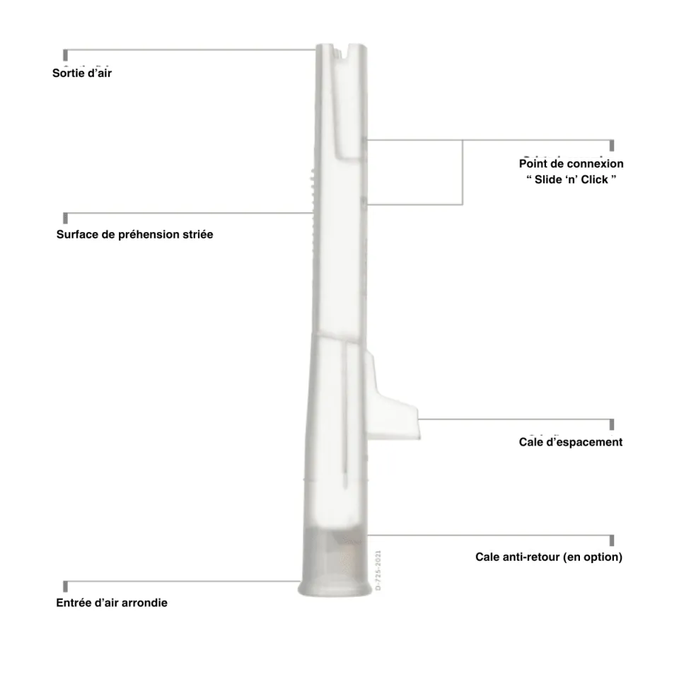 Le système Slide ’n’ Click permet une mise en place rapide, même dans l’obscurité, et une réutilisation immédiate de l’appareil après changement de l’embout.