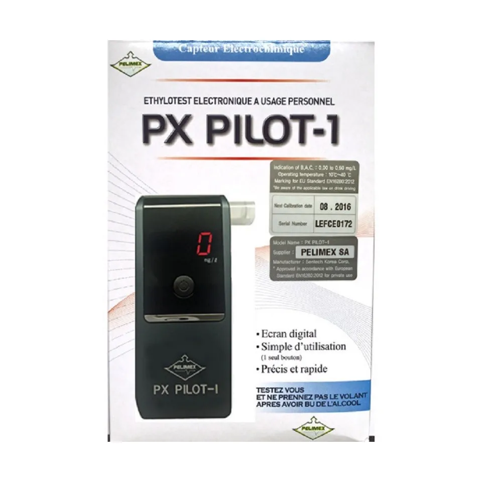 Le PX PILOT-1 est un éthylotest électronique fiable et discret, doté d'un capteur électrochimique très performant combiné à un contrôleur de souffle, lui assurant une mesure du taux d'alcoolémie d'une grande précision. La prise de mesure est simple et rapide, pour vous permettre de vous sécuriser lors de vos sorties. Avec les embouts disponibles, faites profiter vos amis de ses mesures pour que tout le monde profite des instants heureux et ne prenne pas de risque inconsidéré. Sa finition épurée et son faible encombrement lui permettent de se glisser partout en toute discrétion Nos solutions de prévention Pour le grand public et pour les contrôles occasionnels L’éthylotest électronique PX PILOT-1, certifié conforme à la norme NF EN 16280 en vigueur, est la solution la plus fiable, simple et pratique à votre disposition. Discret, efficace pour un usage occasionnel, en soirée, entre amis.