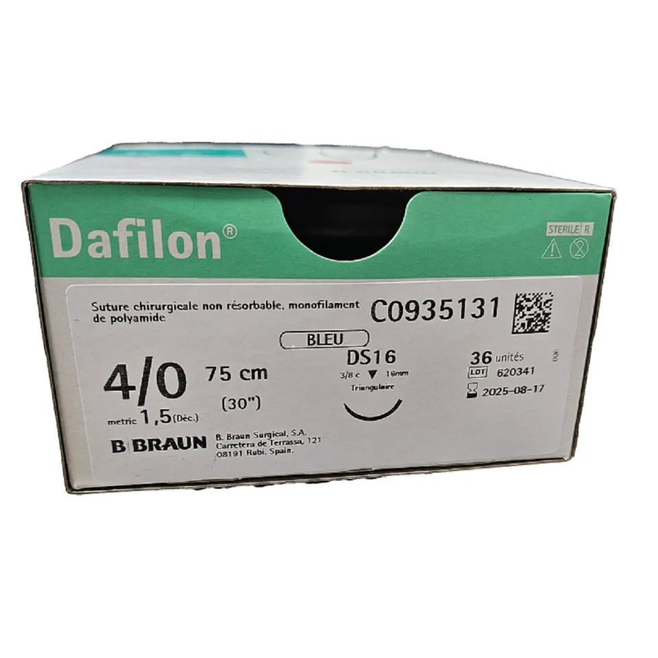 Fil chirurgical monofilament non résorbable en polyamide Product Picture Enlargement CW Dafilon® Dafilon® est un fil chirurgical monofilament non résorbable synthétique composé de polymères de polyamide 6/6.6 (bleu), polyamide 6.6 (noir) ou polyamide 6 (incolore). Dafilon® bleu et Dafilon® incolore sont indiqués pour la fermeture de plaies superficielles et la chirurgie plastique. Dafilon® bleu est également utilisé en neurochirurgie. Dafilon® noir est utilisé pour les interventions ophtalmiques et microchirurgicales. Comme toute suture de nylon, bien que non résorbable, une hydrolyse progressive de la suture peut se produire, entraînant une diminution de sa résistance dans le temps. Avantages Souple, aisé à manipuler et nouer Bon passage intra-tissulaire Excellente histocompatibilité Indication Fermeture cutanée Chirurgie plastique et reconstructrice Microchirurgie Ophtalmologie