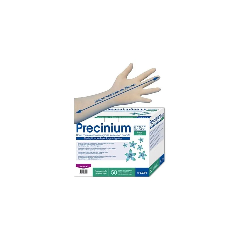 Gants chirurgicaux PRECINUM en latex stériles non poudrés. Gant de chirurgie stérile en latex non poudré, idéal pour tout acte médical et chirurgical. Forme : Manchettes longues, Ambidextre. Couleur : Blanc laiteux. Vendus en boite distributrice de 50 paires de gants stériles emballées en sachet individuel.