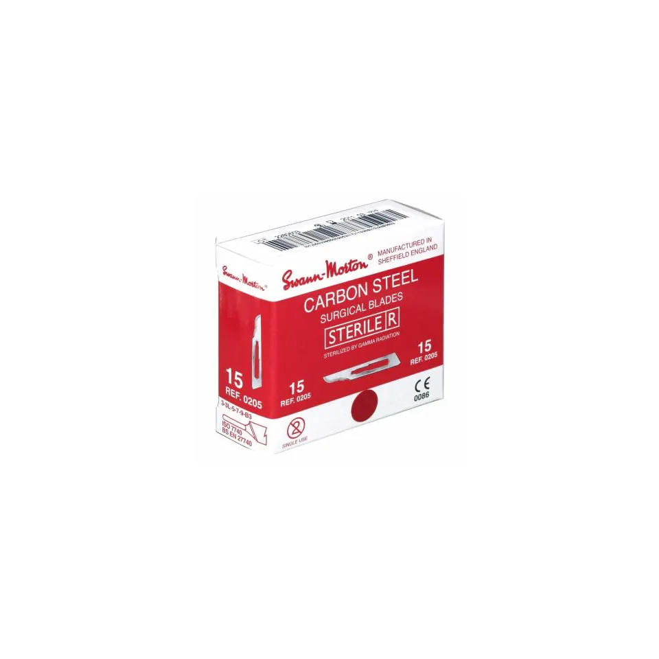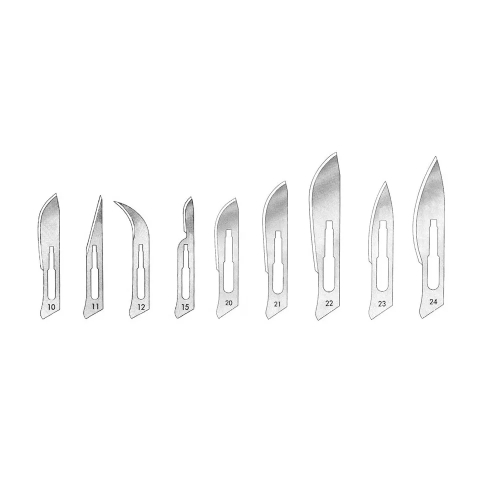 Les lames de chirurgie stériles sont en acier au carbone et acier inoxydable. Les lames se fixent sur un manche N°3 ou N°4 gradué. Elles sont conditionnées en boite de 100 lames. Les lames de bistouris n° 10,11,12,15 s'utilisent avec le manche n°3 . Et les lames de bistouris n°21,22,23,et 24 s'utilisent avec le manche n°4.