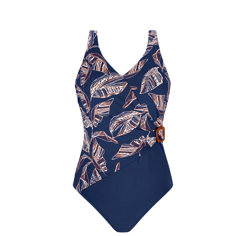 La brassière intérieure est équipée de poches bilatérales pour maintenir en place l'Aqua Wave ou la prothèse mammaire. Enfin, le maillot de bain est agrémenté d'un élégant motif de feuille et d'une boucle en bois à la taille pour plus de style.
