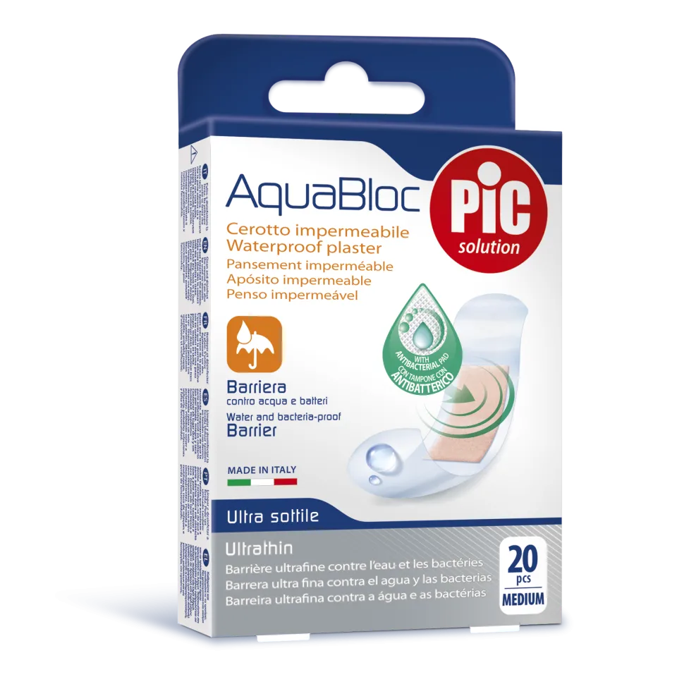 Boite de 20 pansements transparents 19x72cm ultrafin et aéré, support spécial en polyuréthane, conçu et développé pour garantir une protection maximale de la plaie contre l eau et les bactéries, les principaux obstacles à la guérison. Invisibles grâce à leur film spécial en polyuréthane . Barrière imperméable contre l eau et les bactéries, aéré , il est possible de le garder sur la peau plusieurs jours. Le nouveau pansement Aquabloc a la particularité de pouvoir s'utiliser dans toutes les situations où la peau est réchauffée ou sue, celles qui mettent l'adhésif à l'épreuve, comme quand on va à la piscine, à la mer, quand on prend des douches ou des bains chauds, etc. Adaptable même sur les zones les plus difficiles du corps.