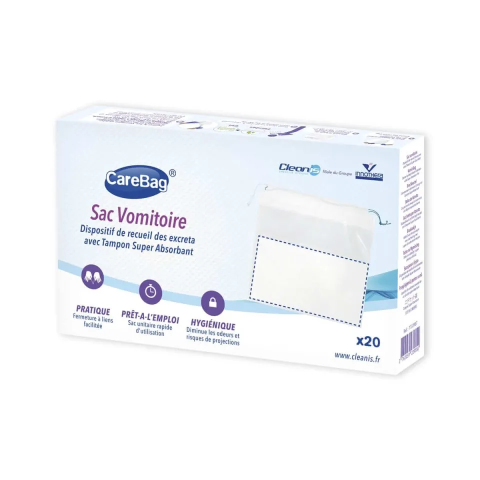 Le sac vomitoire CareBag de Cleanis est une solution hygiénique et pratique pour gérer les situations de vomissements. Grâce à son tampon absorbant qui gélifie instantanément les liquides et neutralise les odeurs, il assure confort, propreté et sécurité en toutes circonstances.