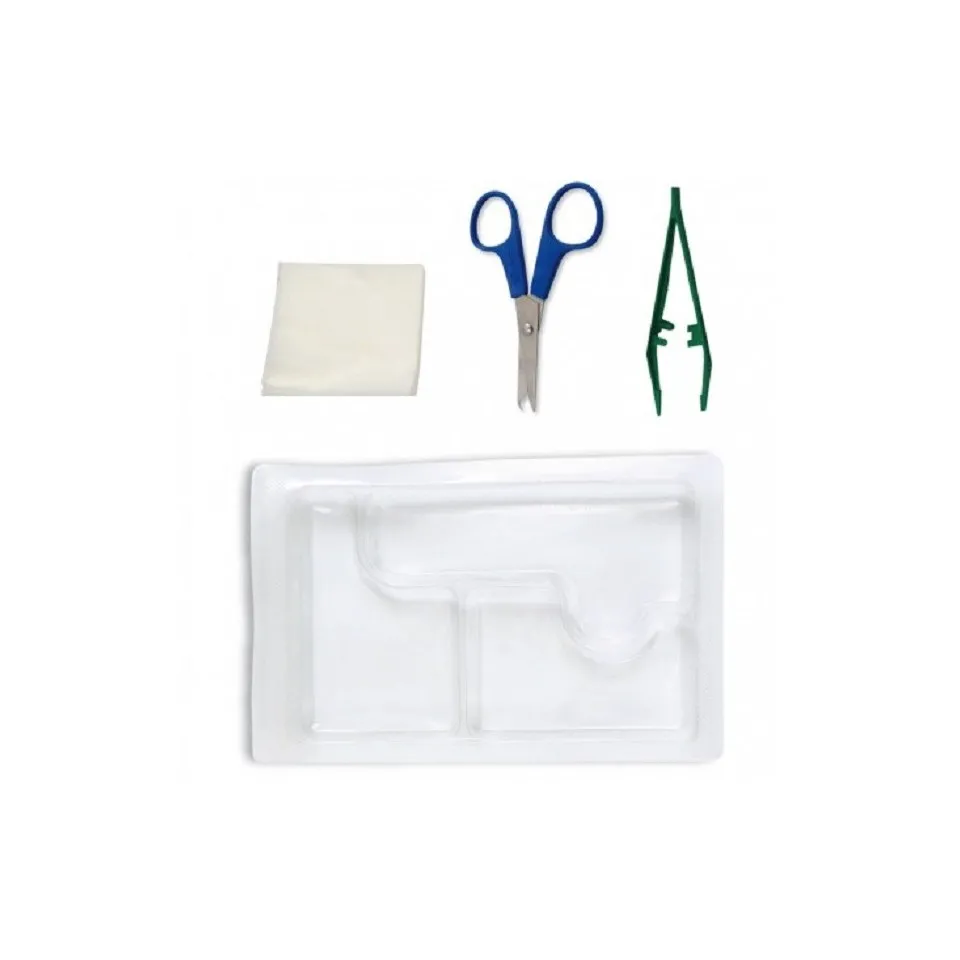 1 pince anatomique 1 coupe fils 1 compresse de gaze 7.5 x 7.5 30 gr A l'unité ou carton de 50 sets.