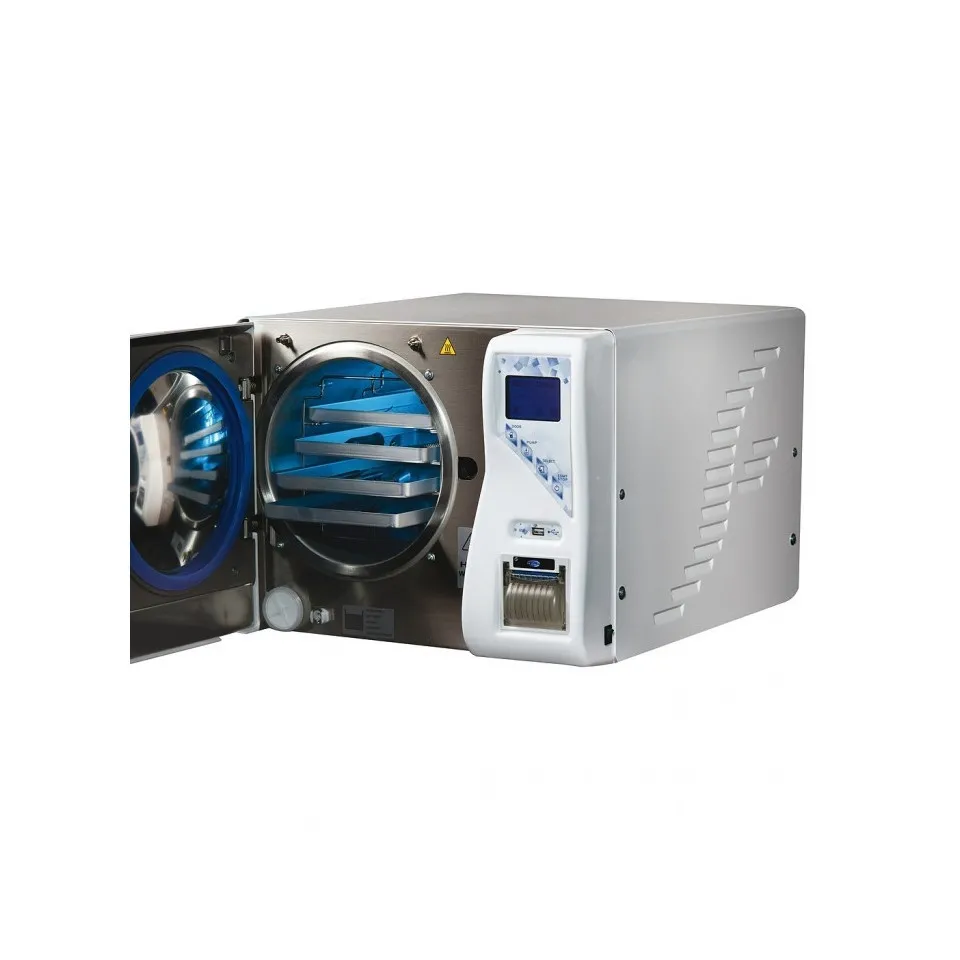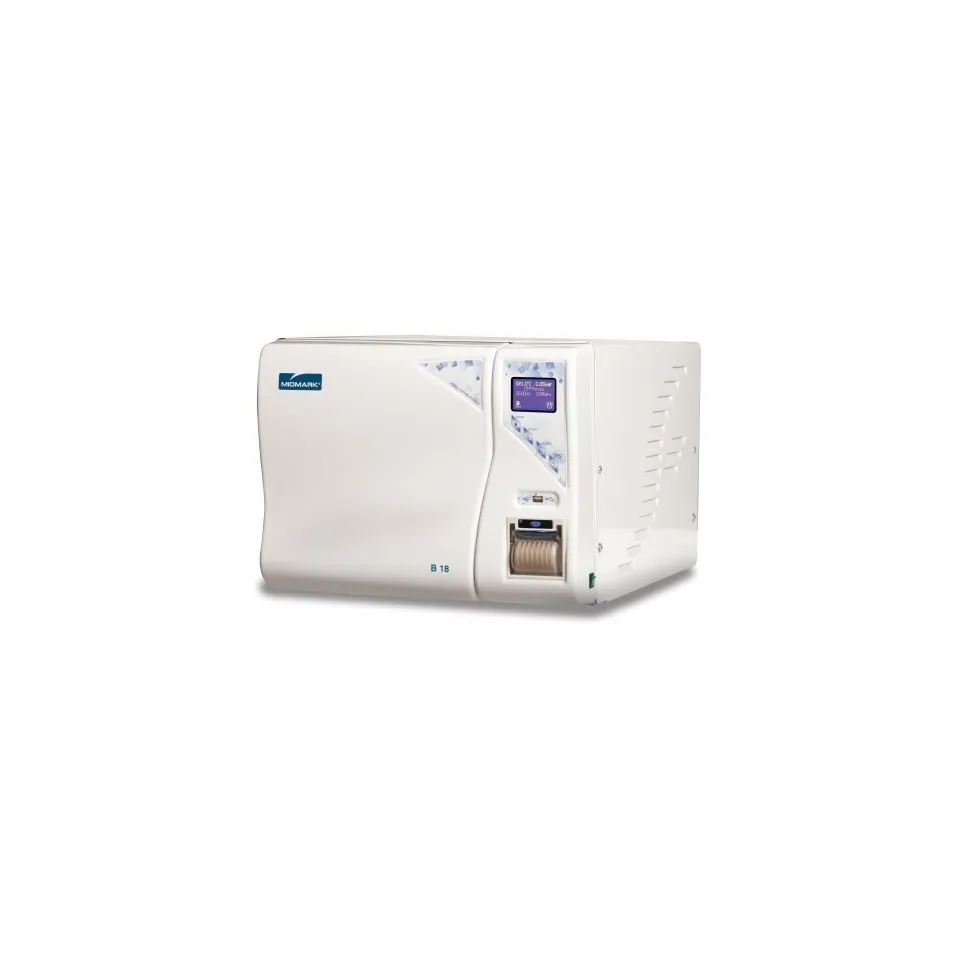 Conforme à la norme BS EN13060, l'autoclave B18 est livré avec un large éventail de fonctionnalités pour une utilisation facile. Fermeture motorisée Cycles de stérilisation préprogrammés Impression automatique des cycles de stérilisation Traçabilité des données et imprimante intégrée Peut être connecté à un système de déminéralisation ou d'osmose inverse Porte-plateau réversible (plateaux ou cassettes) Dimensions extérieures: Profondeur: 610 mm Largeur: 505 mm Hauteur: 400 mm Dimensions du plateau (profondeur de la chambre): Quantité: 4 Dimensions: 185 mm x 285 mm x 17 mm Volume de la cuve: 18 litres Poids de la machine vide: 56 kg Réservoir d'eau interne (propre et eaux usées): 2 litres Nombre de cycles avec chargement d'eau (indicatif): 8 Poids stérilisable emballé: 3 kg Poids stérilisable non emballé: 4 kg Matériau poreux: 1 kg Tension d'alimentation: 220 - 240 V Fréquence du secteur: 50 - 60 Hz Puissance nominale: 2 400 W Cycles test Bowie & Dick, Helix et test de vide CONFORMITE Autoclaves de classe B Certifié ISO 9001 et UNI EN ISO 13485 Directives : Dispositifs médicaux 93/42/CE Récipients sous pression 97/23/CE Petits stérilisateurs à la vapeur EN 13060 Compatibilité électromagnétique CEI EN 61326-1 Règles de sécurité pour stérilisateurs CEI EN 61010-2-40 ADAPTABILITE Raccordement possible d'un déminéralisateur ou osmoseur Porte plateaux réversibles (utilisation de plateaux ou cassettes) CONFORT Fermeture de porte automatique Affichage programmable dans votre langue Cycles de stérilisation préprogrammé Remplissage/vidange en eau par pompe automatique Impression automatique du cycle de stérilisation systèmes professionnels de stérilisation