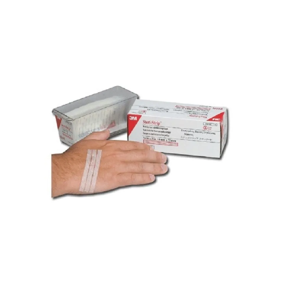 Les sutures cutanées Steri-Strip de 3M Medica sont des bandelettes en support microporeux renforcées de fibres de polyester pour la fermeture rapide et efficace des plaies superficielles. Enduites d'un adhésif hypoallergénique, elles permettent la réalisation, surtout en combinaison avec des fils ou des agrafes, de sutures cutanée solides et esthétiques. Les sutures Steri Strip sont prêtes à l'emploi une fois retirées de leur emballage stérile. Elles sont particulièrement résistantes, même en milieu humide, et assurent une cicatrisation esthétique des plaies. adhésif hypoallergénique respectueux des tissus cutanés en pochette stérile très résistantes au milieu humide port confortable et respirant retrait facile bon affrontement des berges et tension uniforme disponible en différentes tailles selon le type de blessure dimensions variables Sachet de 3 sutures.