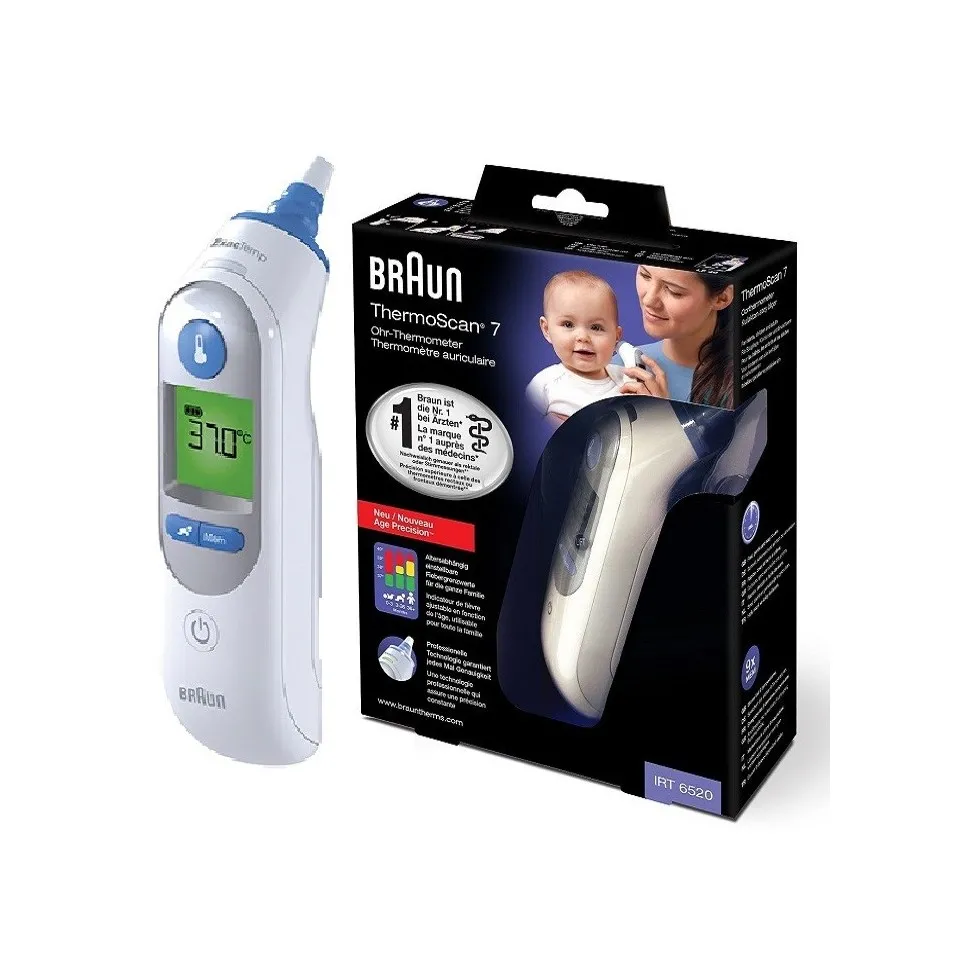Le thermomètre Thermoscan IRT 6520 a été élaboré avec soin pour prendre des mesures de température auriculaire précises et rapides en toute sécurité. Ce thermomètre mesure la chaleur infra rouge émise par le tympan et les tissus environnants. Pour éviter les écarts de température trop importants, le capteur lui même est à une température proche de celle du corps humain. Lorsque le Thermoscan est placé dans l'oreille,il contrôle de manière continue la radiation infrarouge. La prise de température est terminée et le résultat est affichée à l'écran uniquement lorsqu'une mesure précise est garantie. La forme du thermomètre empêche tout risque d'insertion trop profonde dans le conduit auditif, de manière à ne pas endommager le tympan.