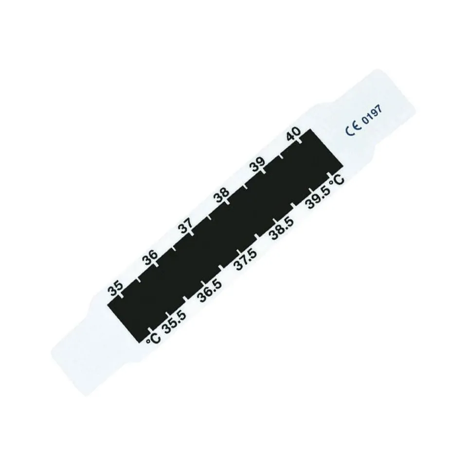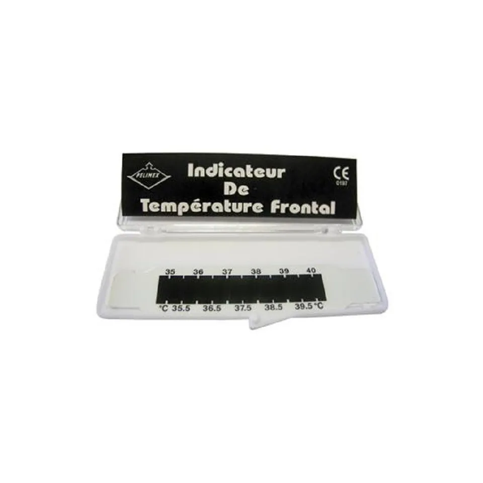 Le thermofront médical est rapide,pratique et réutilisable . Ses caractéristiques sont : - Gamme de prise de mesure de + 35,0°C à + 40°C . - Structure : Plaquette réalisée dans un film polyester . - L'échelle des températures est imprimée par sérigraphie sur la bandelette. - Les différentes solutions de cristaux liquides réagissent à la chaleur en révélant une couleur en fonction de la température frontale. Précautions : - La prise de température doit être faite dans une pièce entre 20°C et 30°C. - Mesure à Intervalle de 0,5°C,précision ±0,3°C . Température de stockage : - Entre 5°C et +65°C avec une humidité relative entre 15% et 95% - Ne pas exposer aux rayons du soleil . Dimensions : 92 x 18mm . Temps de mesure : 15 secondes.