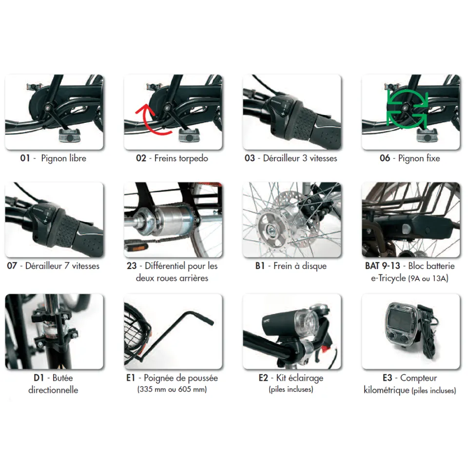 Le guidon est réglable en hauteur et en inclinaison, le frein V-Brake à l'avant bénéficie de la position parking, la selle est réglable en hauteur et le châssis bas permet un accès très facile. Sur ce modèle, le pignon du tricycle est fixe. De nombreuses options sont disponibles pour que le tricycle corresponde parfaitement à vos besoins, vous pouvez en retrouver un aperçu en image.