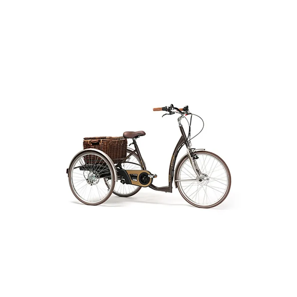 Le modèle de tricycle VINTAGE est un modèle de tricycle adulte dans une version look rétro. Ce tricycle représente un design élégant et raffiné, mixte et intemporel. De nombreux accessoires sont disponibles dans le look vintage comme la malle en osier à l'arrière par exemple. Ce tricycle existe en version E-bike et avec moteur d'assistante électrique. Le modèle VINTAGE dispose d'un guidon réglable en hauteur et en inclinaison, d'une selle réglable en hauteur et d'un châssis plutôt bas pour permettre un accès facile. Le tricycle est équipé d'un frein V-brake à l'avant avec position parking et d'un frein à disque à l'arrière en option. Son grand panier métallique de transport à l'arrière est très appréciable pour déposer le nécessaire pour partir en balade. De nombreuses options sont disponibles pour que le tricycle corresponde parfaitement à vos besoins, vous pouvez en retrouver un aperçu en image.